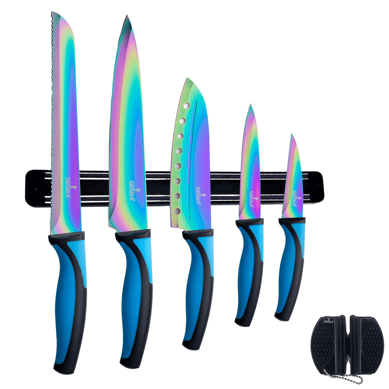 Kitchen Knife Set Kit | Blue Handle, Black Magnetic Rack & Sharpener